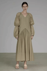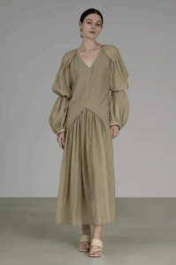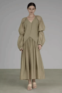A V-neck, pleated and elegant dress with lotus root sleeves