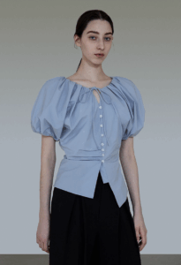 A woman in a French short-sleeved shirt