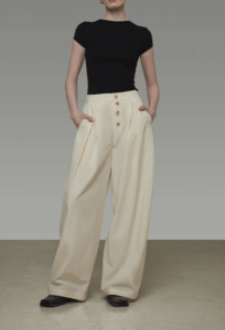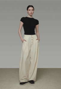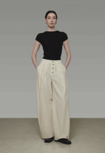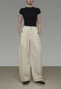 A woman wearing wide-leg pants with buttons